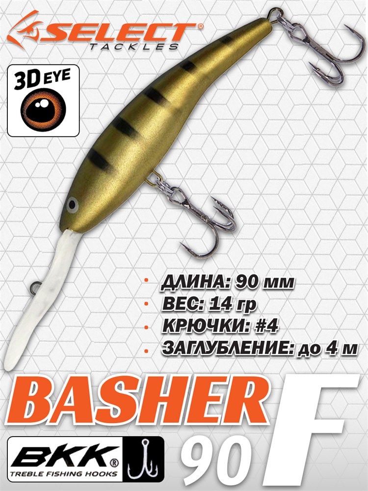 Воблер Select Basher 90F - глубоководная троллинговая приманка для ловли щуки, судака и сома. Хотя, он обладает хорошими аэродинамическими характеристиками, поэтому подойдёт для облова глубоководных участков в заброс, во время рыбалки с лодки. Данный воблер имеет размашистую игру с поперечными колебаниями вдоль своей оси, поэтому создаёт вибрации, привлекающие рыбу с большого расстояния и соблазняющие её на атаку. Шумовая камера внутри приманки облегчает её поиск хищником на большой глубине и в условиях плохой видимости.